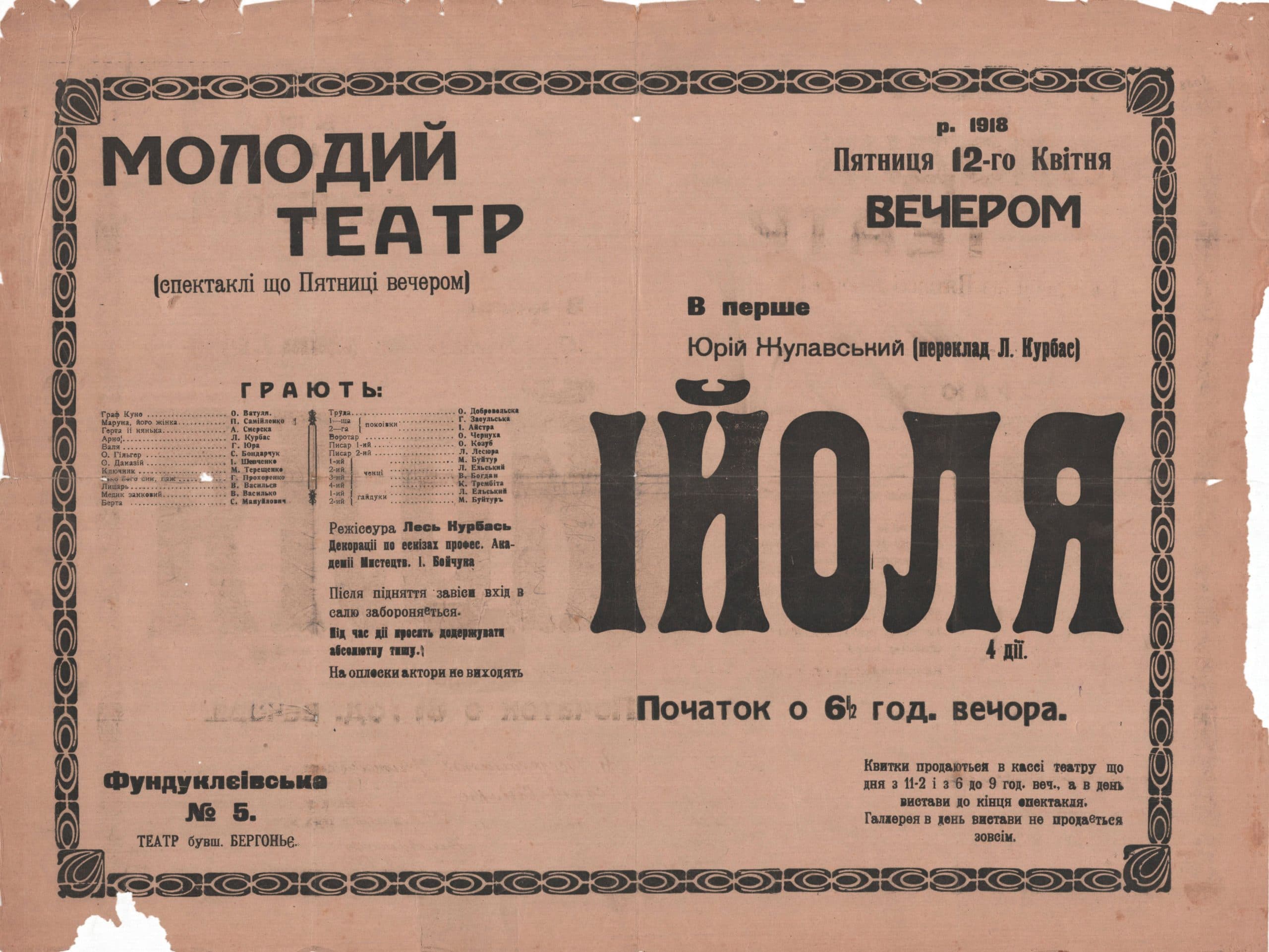 Молодий театр Леся Курбаса ввійшов в історію як перший модерний український театр. Його діяльність небезпідставно вважають естетичним екстернатом національної сцени й найпліднішим часом спільного мистецького учнівства видатних митців Леся Курбаса, Михайла Бойчука, Василя Василька, Анатоля Петрицького, Марка Терещенка, Павла Тичини, Михайля Семенка, Гната Юри та багатьох інших діячів української культури ХХ століття.